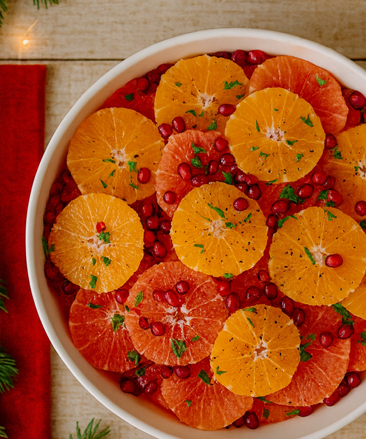 När julens smaker gärna får vara både ljusa, fräscha och lite festliga — då är den här salladen ett självklart inslag. Den kombinerar saftiga apelsiner och granatäpplekärnor med söt honungsrostad mandel, fräsch mynta och en lätt ton av kanel. Perfekt som frisk brytning på julbordet, som nyårs-tilltugg eller till adventsbrunchen.